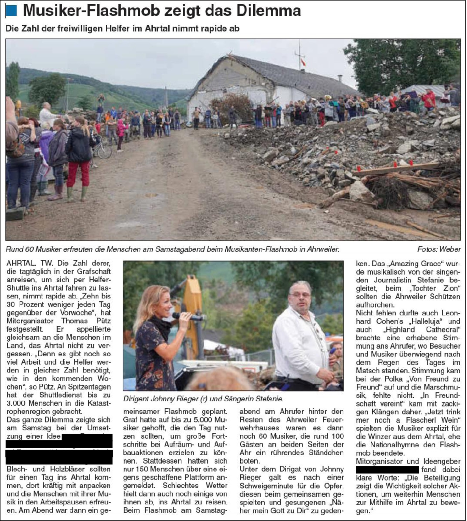 Fluthilfe Ahrweiler, organisiert von mir. Anreise mit Instrumenten und Notensätze die mir als Geschenk für den MV-Ahrweiler mitgegeben wurden. Abends dann ein kleines Gedenkkonzert am Ufer der Ahr in Ahrweiler das von einer handvoll Menschen organisiert wurde mit mir als leitender Dirigent und Musikern die tagsüber auch als Helfer vor Ort waren.
